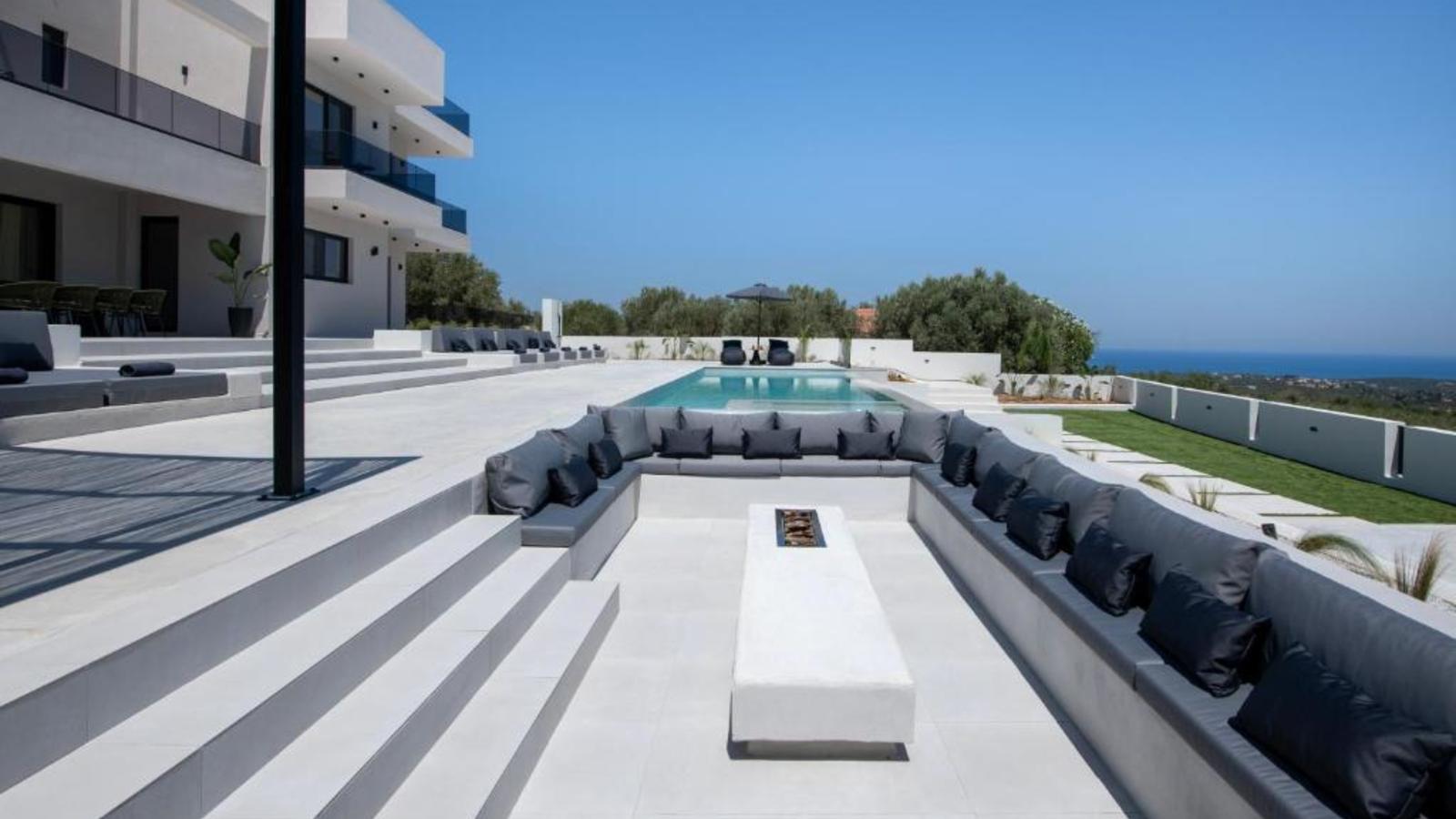 Элегантная современная вилла с 4 роскошными спальнями и великолепной прилегающей территорией с приватным бассейном, романтическим камином с диванами и прекрасно оборудованной зоной барбекю сдается в аренду на острове Крит.